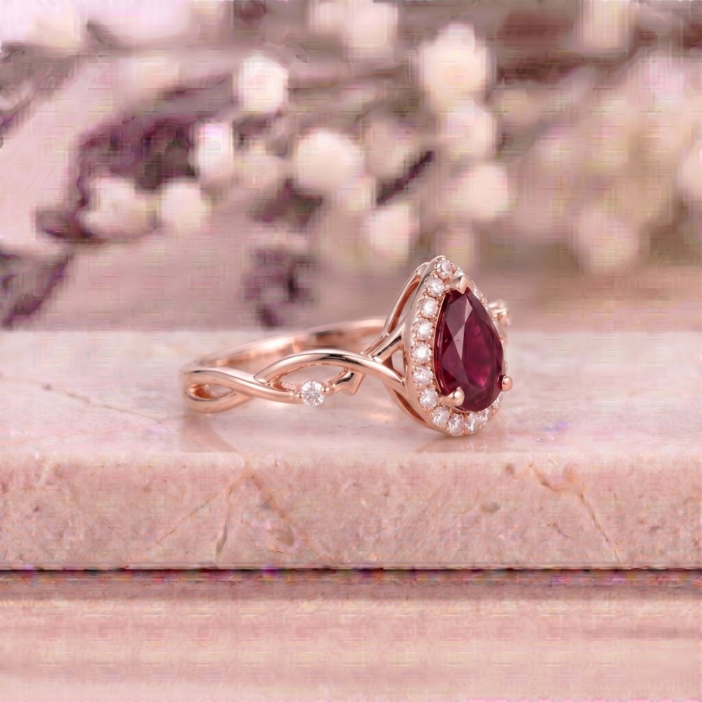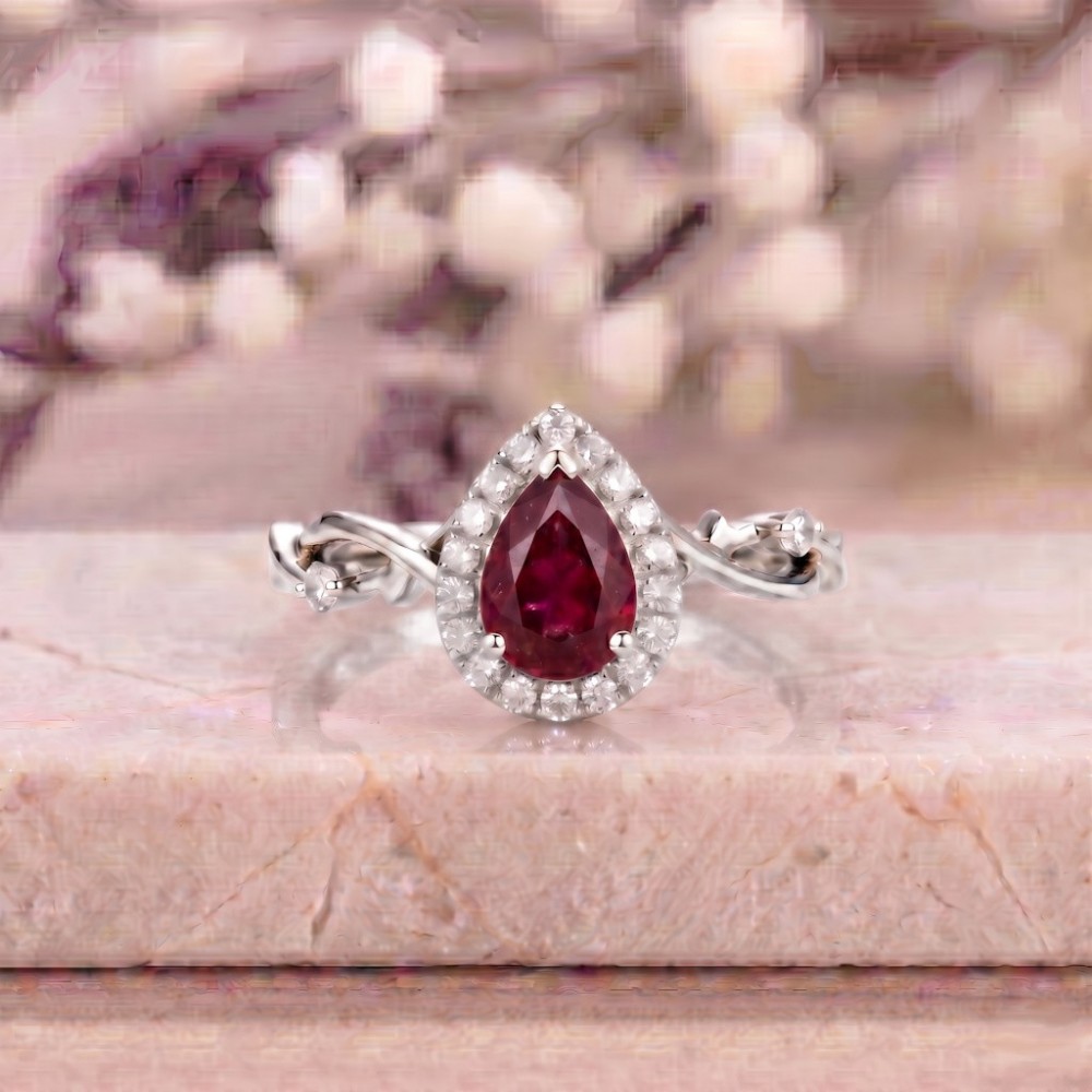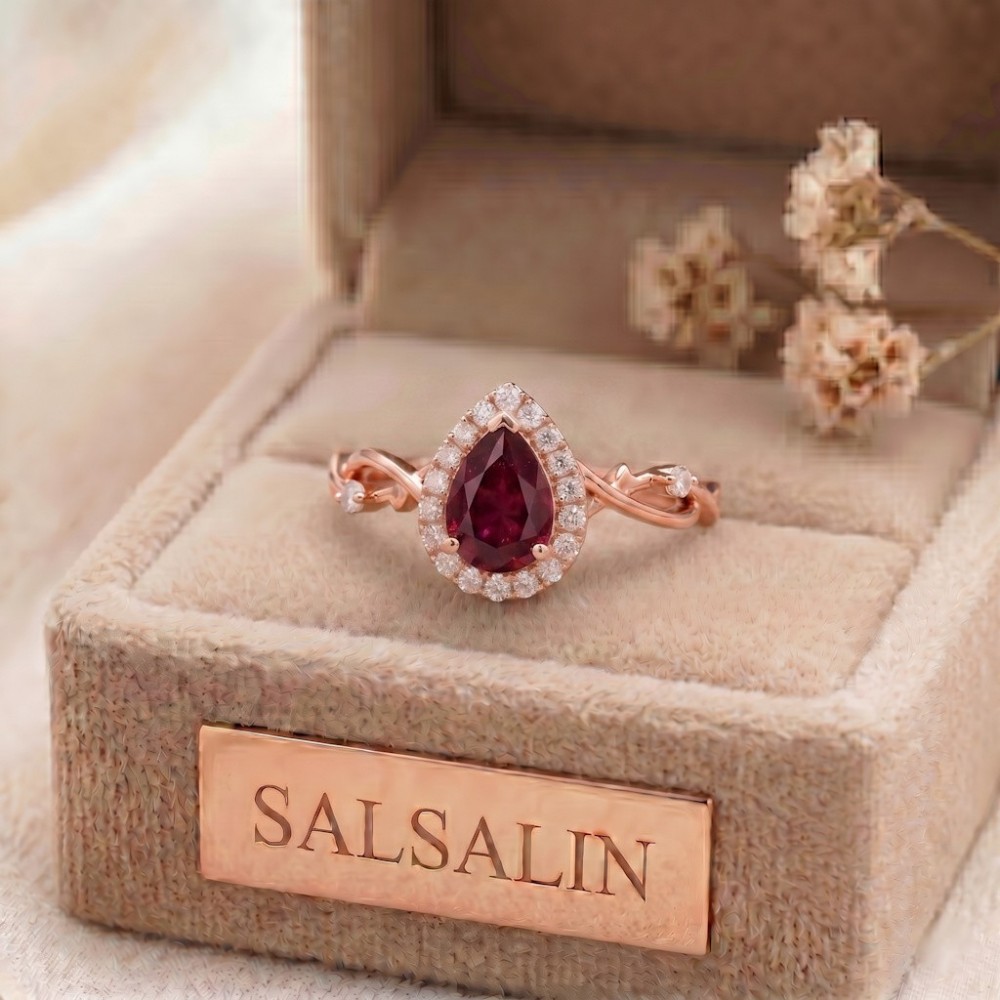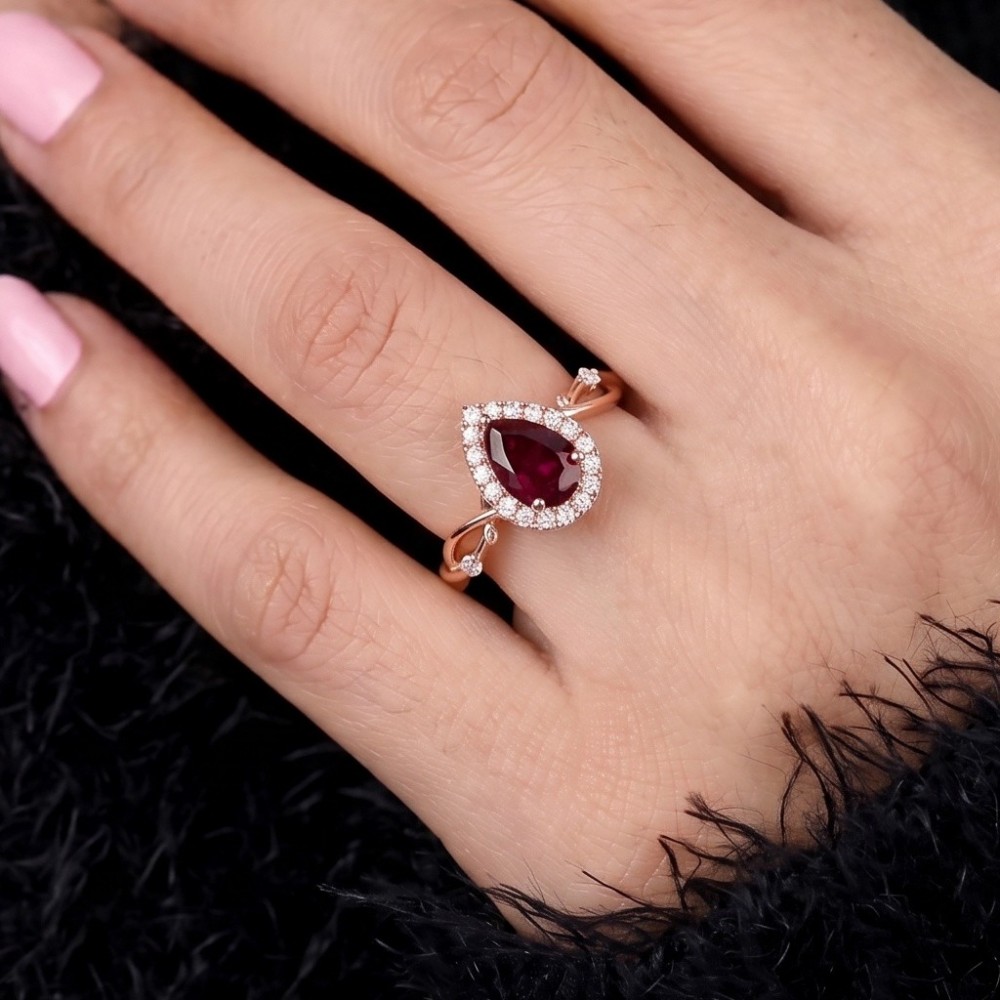 • Bu özel tasarım yüzük merkezde 1.00 karat damla kesim doğal yakut taşı ve 0.14 karat pırlanta ile imal edilmiştir.