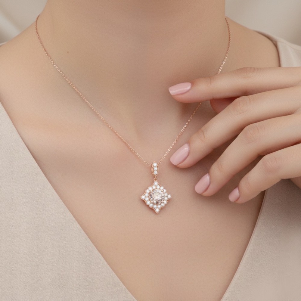 Romantik Bir Dokunuş: Merkezinde büyüleyici pembe bir morganit taşı ve etrafında parıldayan pırlantaların dansıyla süslenmiş bu vintage tarzı kolye, her bakışta kalpleri fethediyor. Zamansız tasarımı, her kıyafete sofistike bir dokunuş katacak.