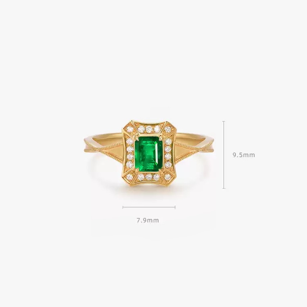 Yüzük merkezde 1.00 karat % 100 naturel zümrüt taşı ve yanlarında 0.09 karat pırlanta ile imal edilmiştir.